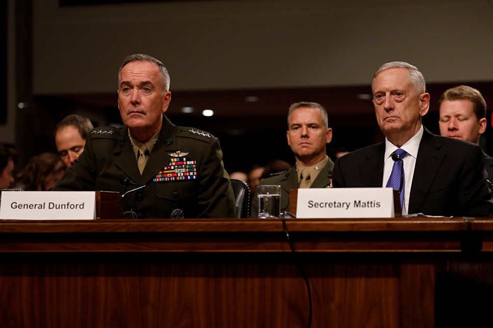 © REUTERS / Aaron P. BernsteinГенерал Джозеф Данфорд и министр обороны США Джеймс Мэттис на слушаниях в комитете по вооруженным силам палаты представителей конгресса США